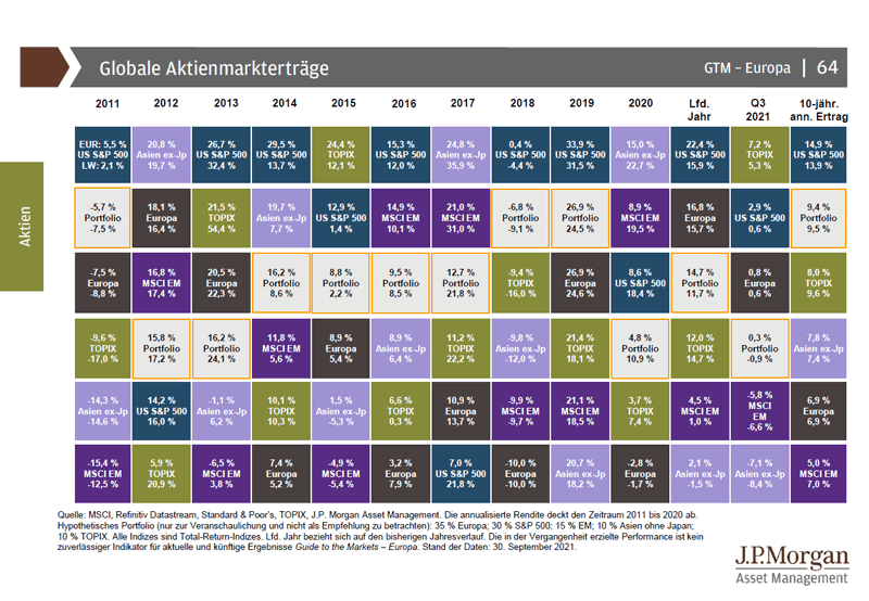 Den «Guide to the Markets» hat J.P. Morgan Asset Management entwickelt, um Kundenberater und professionelle Anleger zu unterstützen, immer auf dem neuesten Stand der Märkte zu sein.
