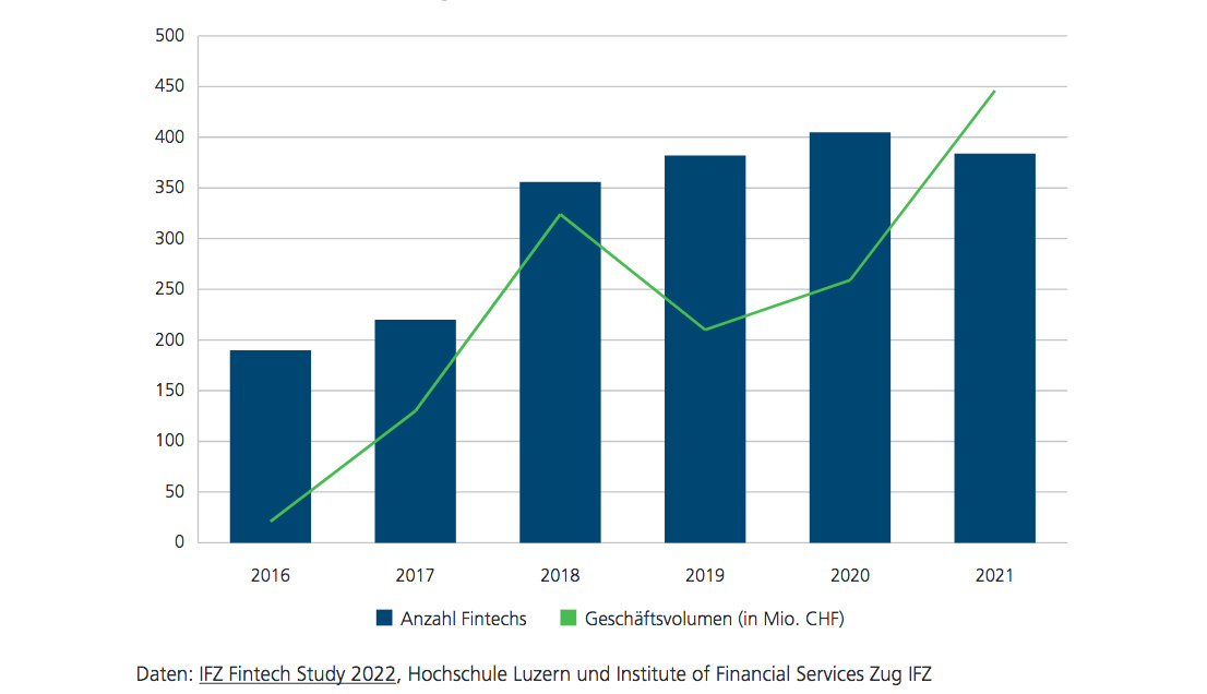 Laut einer Studie des Instituts für Finanzdienstleistungen Zug (IFZ) und der Hochschule Luzern hat die Zahl der Fintech-Firmen im vergangenen Jahr stagniert. Das Geschäftsvolumen legte dennoch zu (vgl. obenstehende Grafik).
