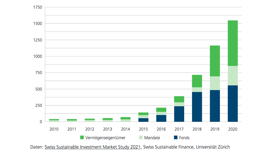 Ein steiles Wachstum wiesen nachhaltige Investitionen auf. Das Sustainable Investment-Volumen schwoll innert eines Jahres um 31 Prozent auf mehr als 1’500 Milliarden Franken an. Dabei verweist das SIF allerdings auf eine Marktumfrage der Vereinigung Swiss Sustainable Finance (vgl. nachstehende Grafik).