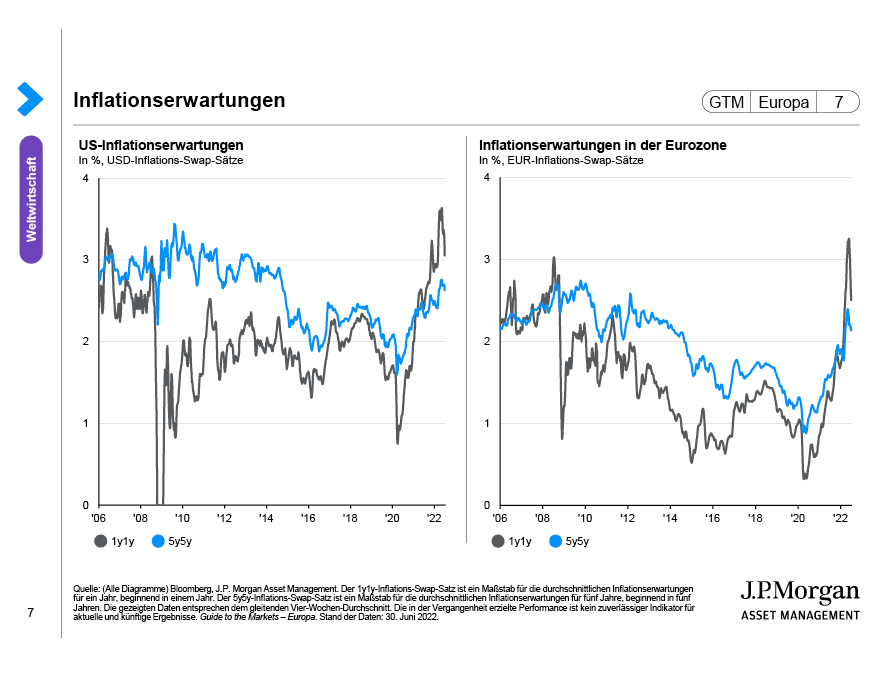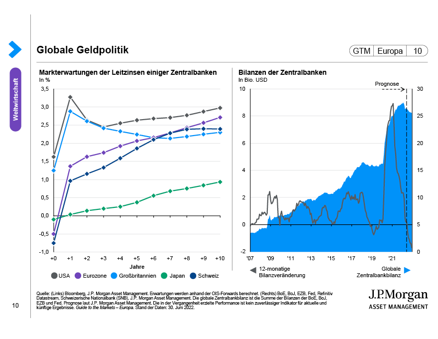 Wenn sich die Inflation parallel zur nachlassenden Wirtschaftstätigkeit abschwächt, dürften die Zentralbanken in der Lage sein, von ihrer äusserst restriktiven Rhetorik im ersten Halbjahr 2022 abzurücken (Seiten 7 und 10).