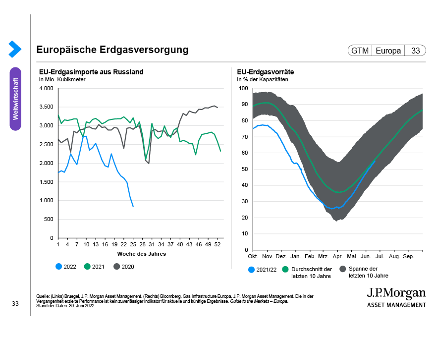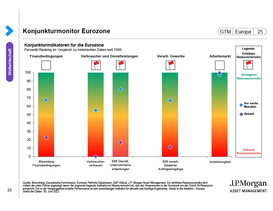 Das Zusammenspiel von höheren Konsumentenpreisen und Zinsen wird im zweiten Halbjahr 2022 voraussichtlich zu einer Konjunkturabkühlung führen. Die Möglichkeit einer Rezession ist genau im Auge zu behalten (Guide to the Markets – Europe Seiten 14 und 25).