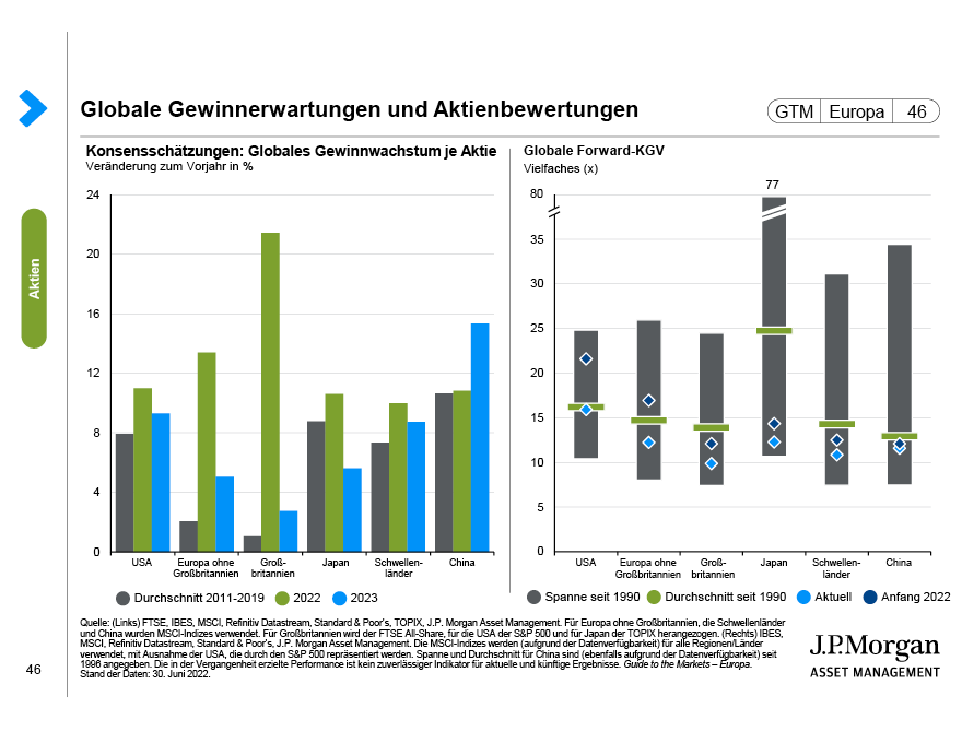 Die nachlassende Nachfrage und steigende Kosten bringen die Firmengewinne unter Druck (Seiten 46 und 50). Die meisten wichtigen Märkte haben jedoch bereits Einbrüche in zweistelliger Höhe verzeichnet, was darauf hindeutet, dass ein Teil des Gewinnrückgangs eingepreist ist (Seite 63).