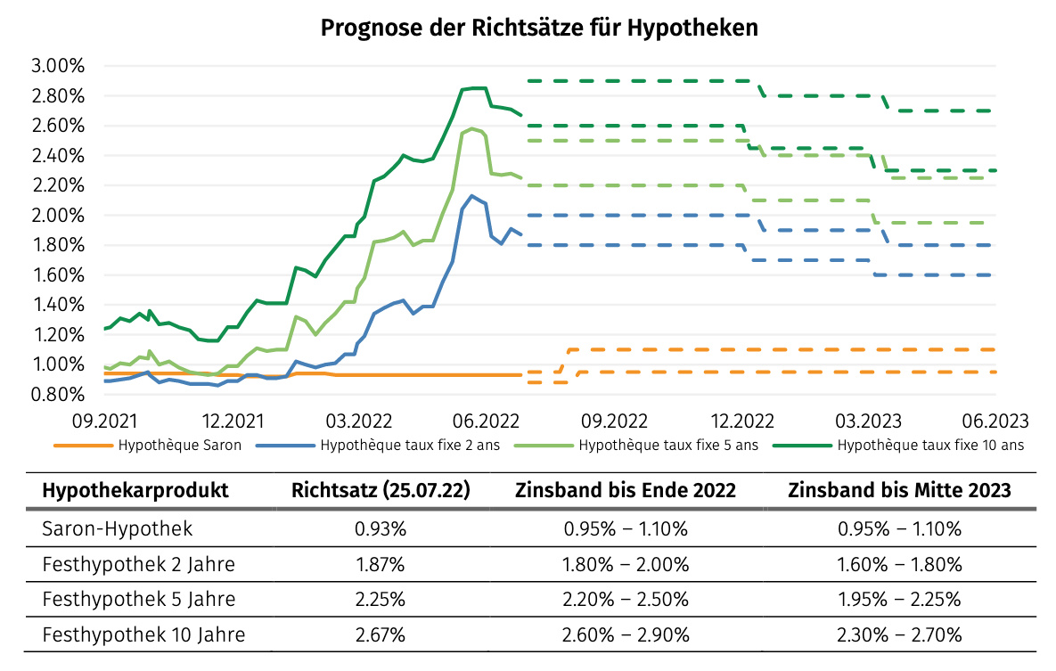 Der Zinspfad, den die Experten bis Mitte 2023 erwarten, zeigt bei den festen Laufzeiten bereits wieder nach unten. Bereits gegen Ende 2022 sowie in der ersten Jahreshälfte 2023 wird mit einem wieder sinkenden Hypozins-Niveau gerechnet. Einzig bei den Saron-Geldmarkt-Hypotheken wird vom derzeit weiter tiefen Niveau mit einem leichten Anstieg gerechnet.