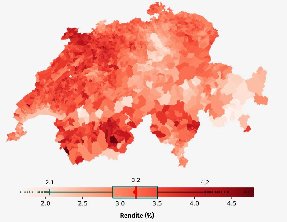 Die Renditen sind im Halbjahresvergleich gestiegen. Über alle Gemeinen betrachtet lag die mittlere Rendite für Wohnungen bei 3,25 Prozent, verglichen mit zuvor 2,90 Prozent. In den Gemeinden würden sie zwischen 2,04 Prozent und 4,21 Prozent variieren. Das entspreche einer Amortisationsdauern zwischen 24 und 49 Jahren.