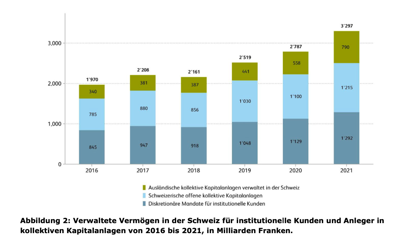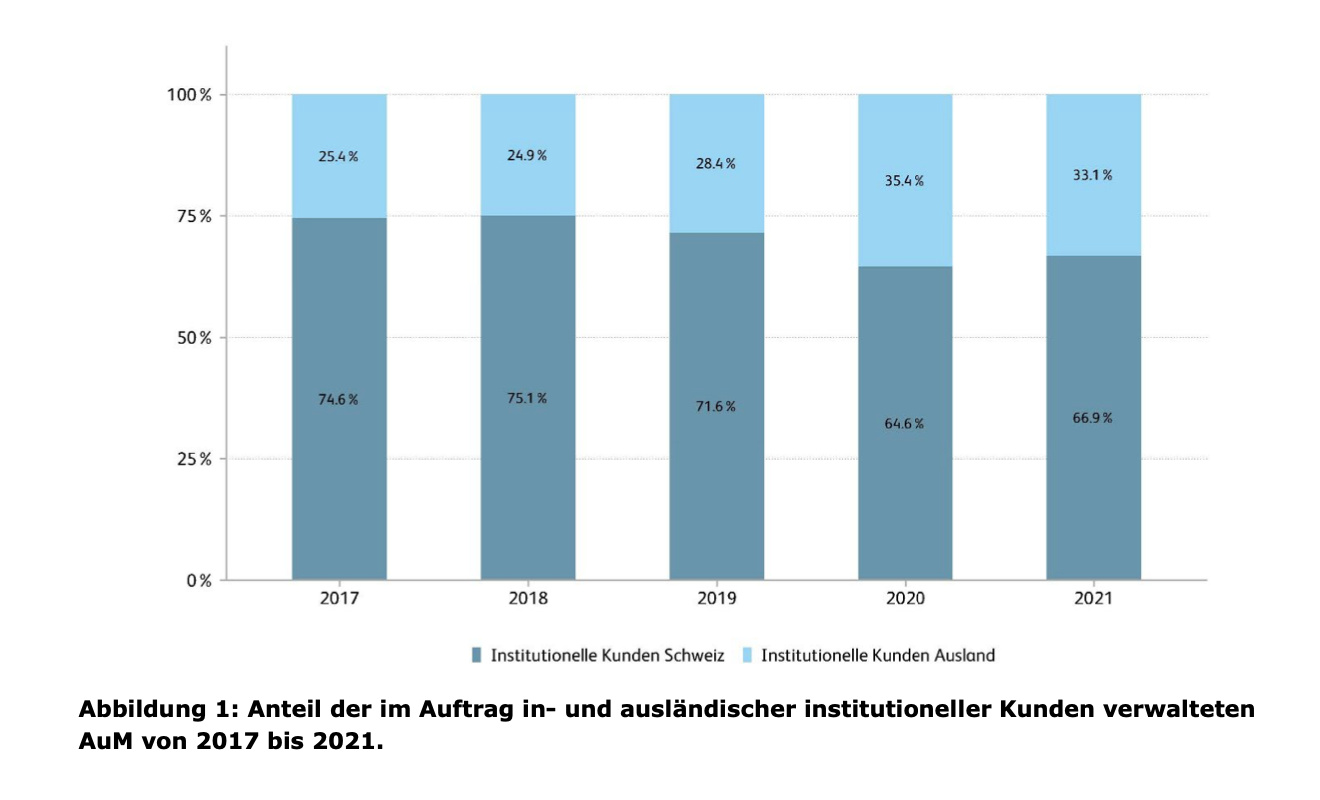 Auch aus der Perspektive des Asset Management nimmt sich die Schweiz als ein globaler Vermögensverwaltungs-Standort aus, auf dem in- und ausländische institutionelle Kunden betreut würden. Seit 2017 sei der Anteil der im Auftrag von ausländischen Vertragskunden verwalteten Vermögen auf 33 von zuvor 25 Prozent gestiegen.