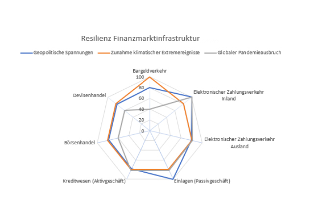 Demgegenüber zeige sich die Finanzmarktinfrastruktur erfreulich resilient gegenüber allen Szenarien, schreiben die Autoren. Der Zahlungsverkehr bleibe in allen Szenarien gewährleistet.