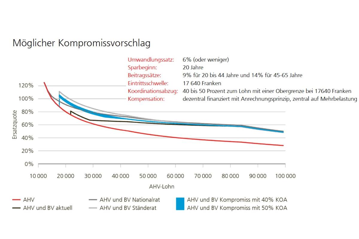 Es sind wohl die trödelnden Parlamentarier, welche die UBS bewogen haben, sich in die Debatte einzuschalten und in einer Analyse vorzumachen, wie die Stellschrauben des BVG richtig angepasst werden können (vgl. Grafik unten). Allerdings soll nach Aussagen von UBS-Spezialistin Veronica Weisser lediglich der Spielraum für eine gute Reform ausgelotet werden. Die UBS will aber dem Parlament keinen eigenen UBS-Kompromissvorschlag vorlegen, relativiert Weisser.