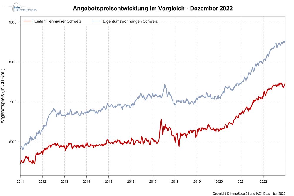 Laut dem «Swiss Real Estate Offer Index», der vom Immobilienberatungsunternehmen Iazi und der SMG Swiss Marketplace Group (Immoscout24) berechnet wird, stiegen die Angebotspreise für Einfamilienhäuser im Dezember um deutliche 1,4 Prozent. Auf Jahressicht betrug die Steigerung damit 4,7 Prozent. Eigentumswohnungen wurden im Dezember mit +0,1 Prozent nur geringfügig teurer, im Vergleich zum Vorjahr summiert sich der Anstieg hier jedoch auch auf markante 6,2 Prozent.