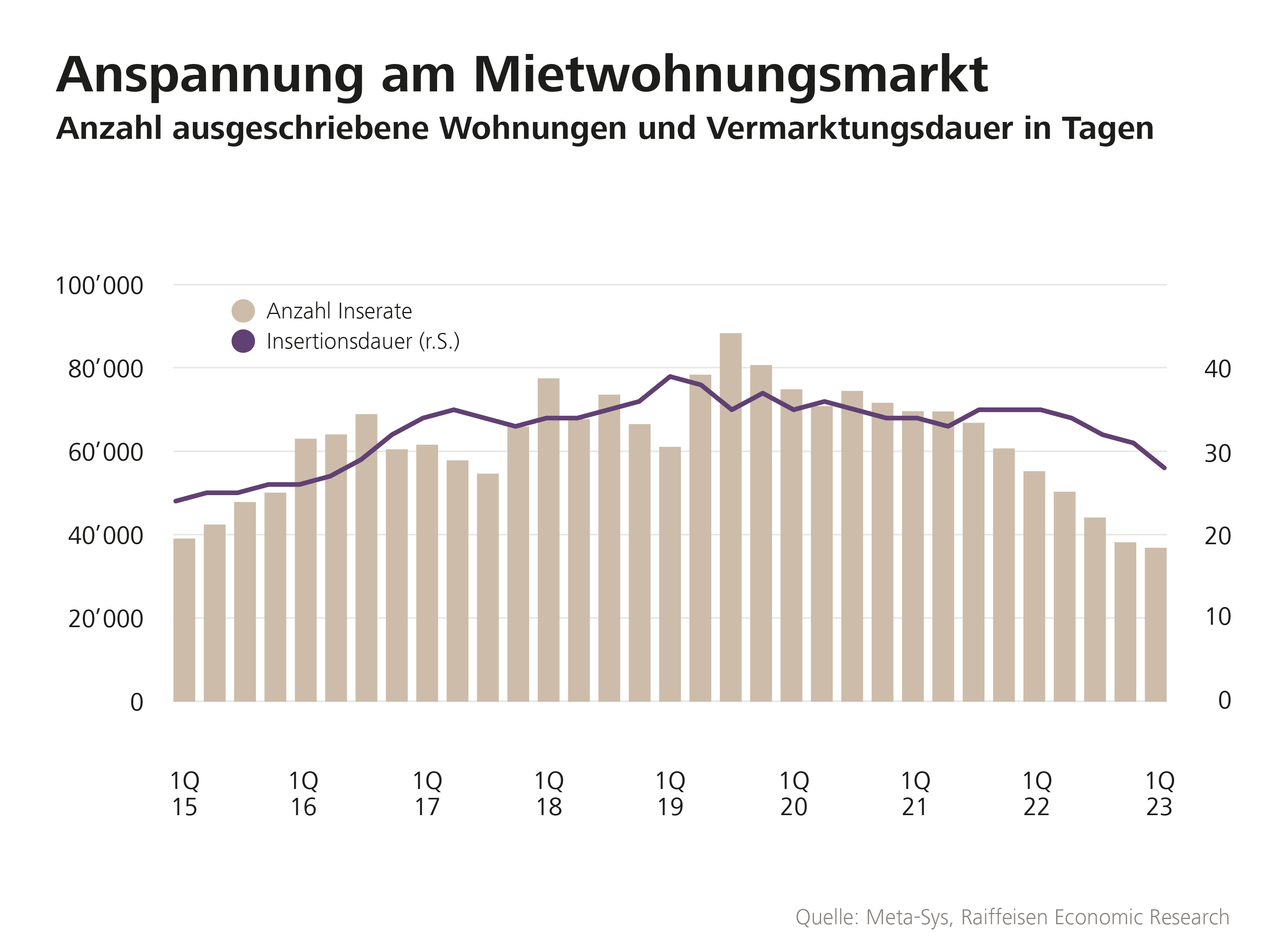 Wenig Aussicht auf Entspannung wird hingegen am Mietmarkt gesehen. Die schweizweite Leerstandsquote von 1,3 Prozent (Mitte 2022) verdecke, dass der Markt in einigen Regionen völlig ausgetrocknet ist. Dies sei insbesondere in den Grosszentren, deren Agglomerationen und in einigen touristischen Hotspots der Fall. In naher Zukunft zeichne sich eine «schnell voranschreitende und bald auch flächendeckende Verknappung von Wohnraum» ab. Darauf würden auch die sinkende Zahl der Mietwohnungsinserate und kürzere Laufzeiten hindeuten. (siehe Grafik)