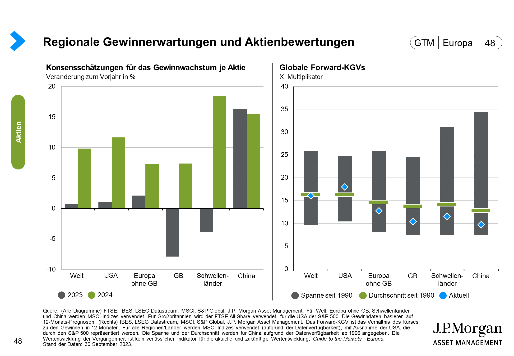 Die meisten Aktien von Industriestaaten liegen auf oder über historischen Durchschnittsbewertungen, was auf den künftigen Gewinnprognosen basiert, die angesichts unserer Erwartung eines künftig schwächeren Wachstums etwas optimistisch erscheinen (Seite 48).