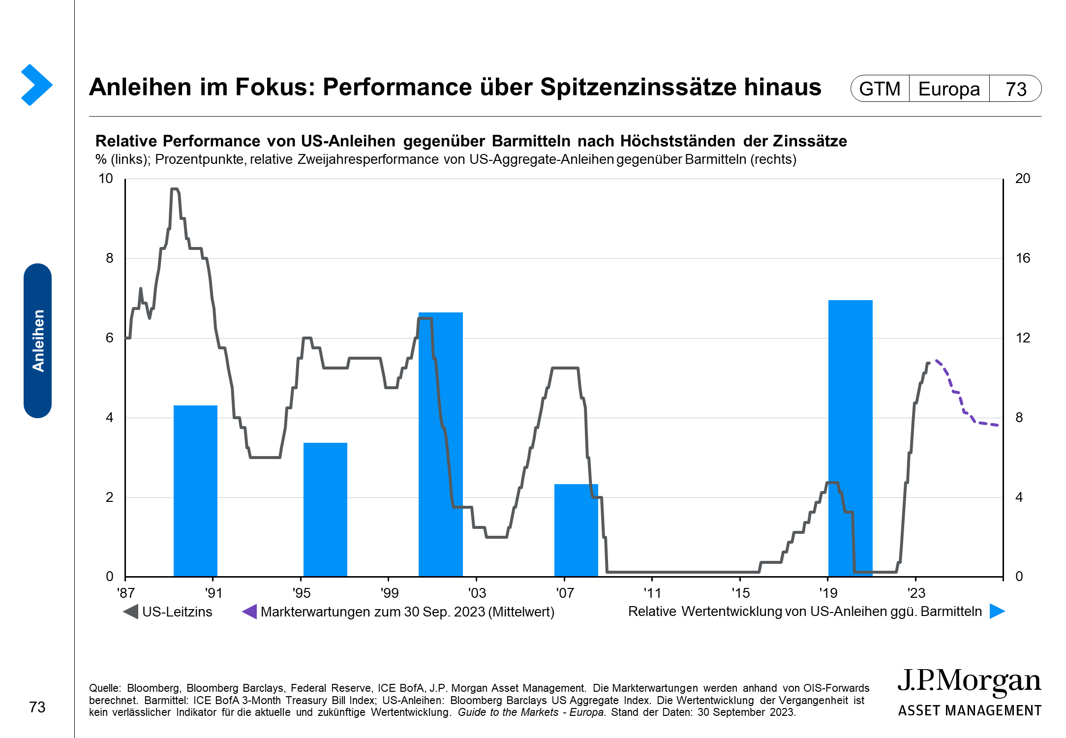 Nach dem Höhepunkt eines Zinserhöhungszyklus der Federal Reserve haben Anleihen in den letzten 35 Jahren auf Sicht von zwei Jahren in jedem Fall besser abgeschnitten als Bargeld (Seite 73).