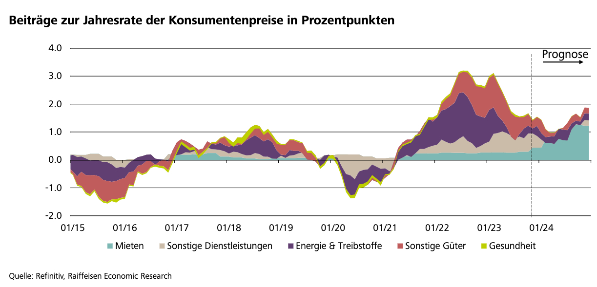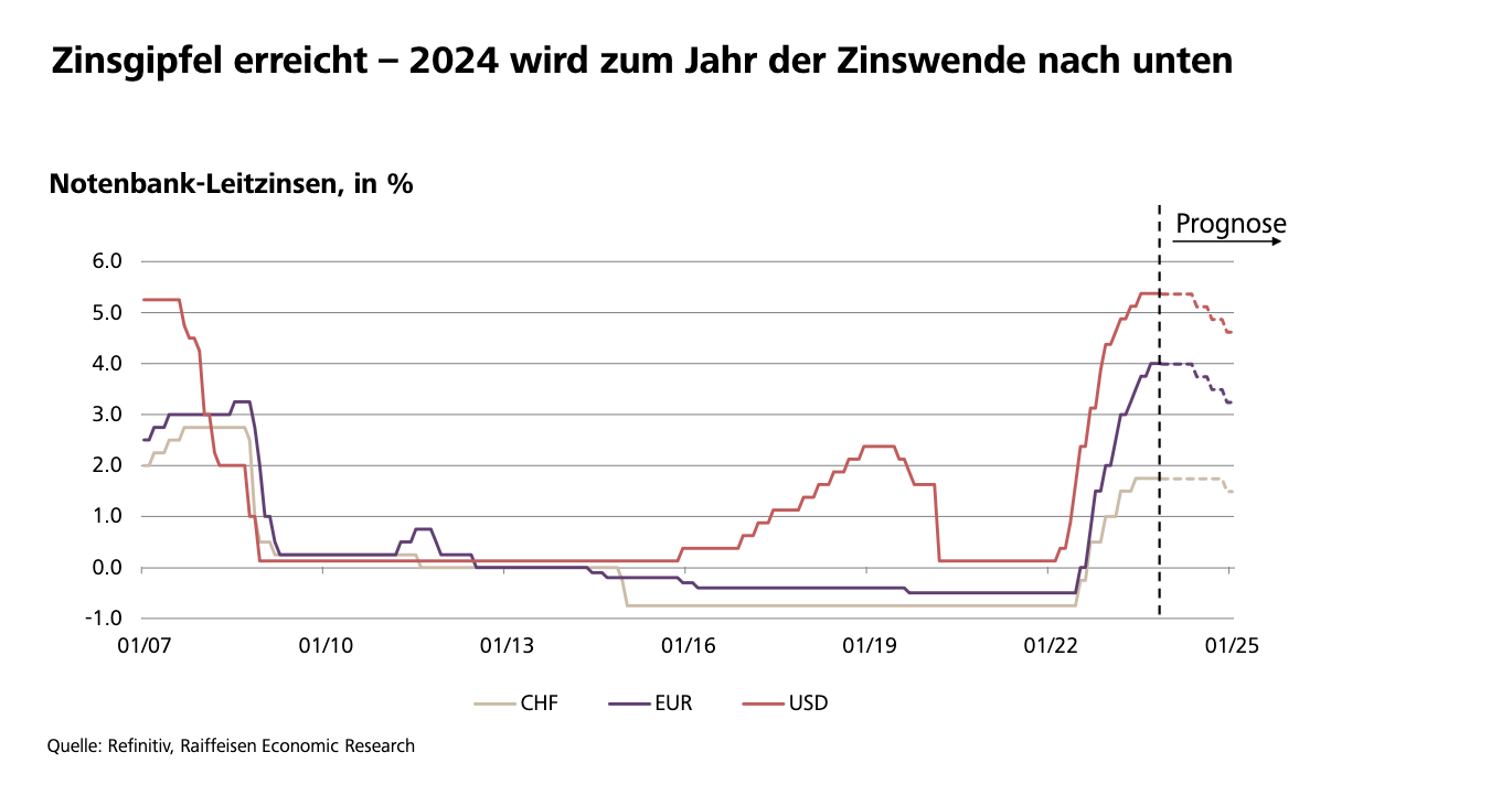 Doch es gibt auch positive Nachrichten. Bei der Inflation sei erst einmal der Höhepunkt überschritten. Die jüngsten Zahlen des Bundesamtes für Statistik hätten unter den Erwartungen gelegen, da offensichtlich der Einfluss der Mietsteigerungen weniger deutlich ausfiel als befürchtet. Im Jahresdurchschnitt wird 2024 mit einer Teuerung von 1,5 Prozent gerechnet.