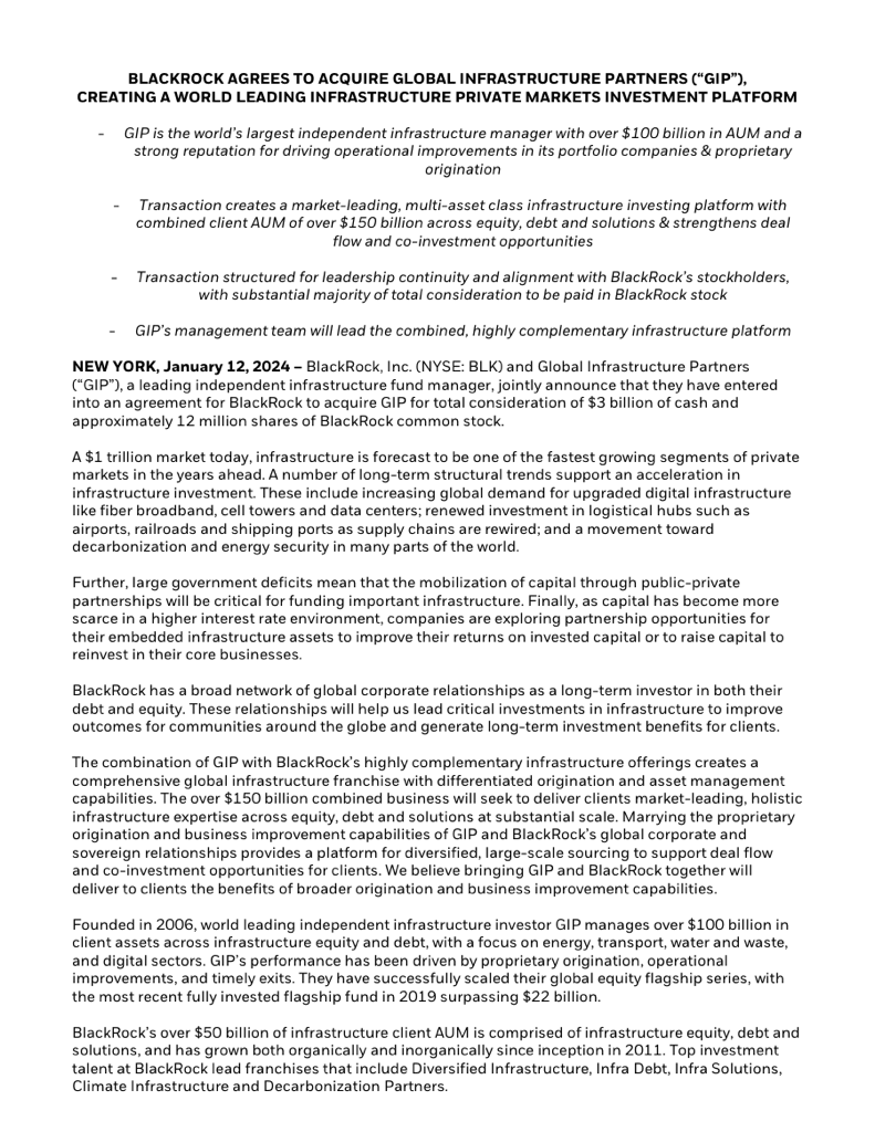 Die Firma GIP wurde 2006 gegründet und verwaltet ein Vermögen von mehr als 100 Milliarden Dollar. Zum Portfolio gehören der britische Flughafen Gatwick, der Hafen von Melbourne sowie Offshore-Windprojekte. Der Abschluss der Transaktion soll im Sommer erfolgen. GIP beschäftigt 400 Mitarbeitende an elf Standorten. Blackrock hat rund 20'000 Beschäftigte. Ziel sei es, eine Plattform für Infrastruktur-Investitionen mit einem Gesamtvermögen von mehr als 150 Milliarden Dollar zu schaffen.
