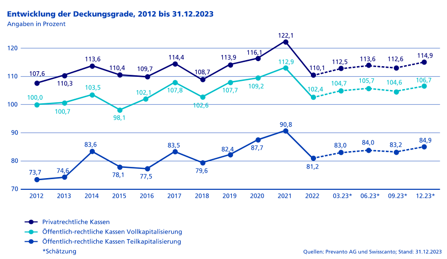 Bei den öffentlich-rechtlichen, vollkapitalisierten Kassen war die Verbesserung etwas bescheidener. Hier liegt der Anteil der Kassen mit einem Deckungsgrad von über 115 Prozent per Ende 2023 bei 16,2 Prozent.