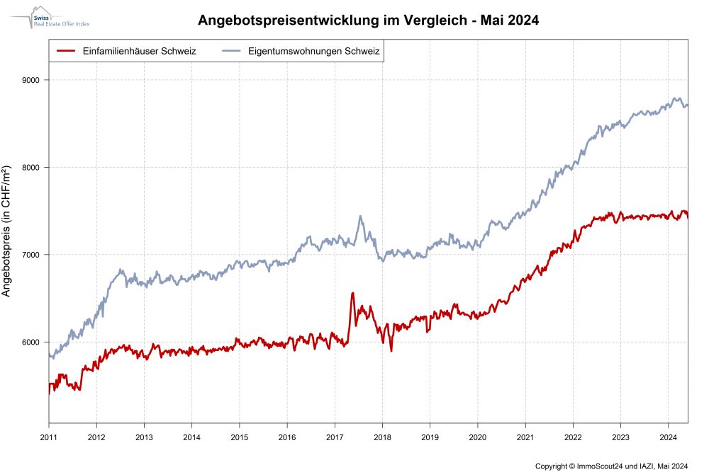 Die Verkäuferinnen und Verkäufer von Einfamilienhäusern sind im Mai von ihren hohen Preisvorstellungen etwas abgerückt. Der «Swiss Real Estate Offer Index» von Immoscout24 und IAZI weist für den Monat Mai einen Rückgang in dieser Objekt-Kategorie von 1,4 Prozent aus. Damit liegen die Preise auf dem gleichen Niveau wie vor Jahresfrist, heisst es in der am Mittwoch veröffentlichten Erhebung.