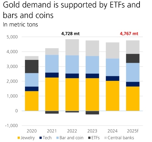 UBS hebt vor diesem Hintergrund auch die Schätzung für die Gold-Nachfrage durch Exchange Traded Funds (ETF) für 2025 von 450 auf 600 Tonnen an. Auch die Käufe von Zentralbanken sollten hoch bleiben und nur leicht unter dem letztjährigen Rekord liegen. Die weltweite Goldnachfrage wird gemäss dieser Schätzung 2025 um 3 Prozent auf 4'760 Tonnen steigen – das wäre der höchste Jahreswert seit 2011, wie UBS anmerkt (siehe Grafik oben).