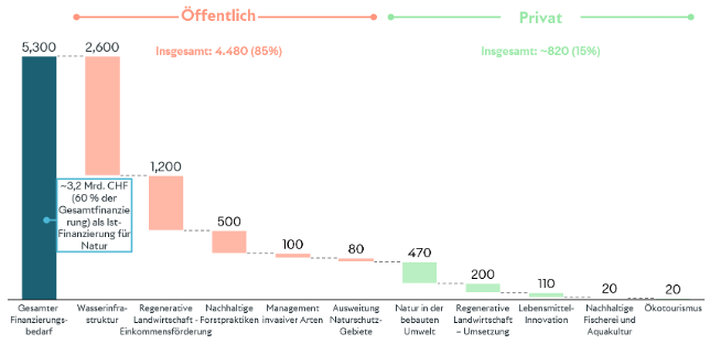 Die Herausforderung liegt nun in der Differenz zu den aktuellen jährlichen Ausgaben, die sich auf schätzungsweise 3,2 Milliarden Franken pro Jahr belaufen. Um diese zusätzlichen 2,1 Milliarden Franken pro Jahr – ein Anstieg von rund 66 Prozent gegenüber dem heutigen Niveau – zu stemmen, erscheint es in Anbetracht der mindestens mittelfristig angespannten öffentlichen Finanzen unerlässlich, mehr private Mittel für die Erreichung der Naturziele der Schweiz zu mobilisieren.