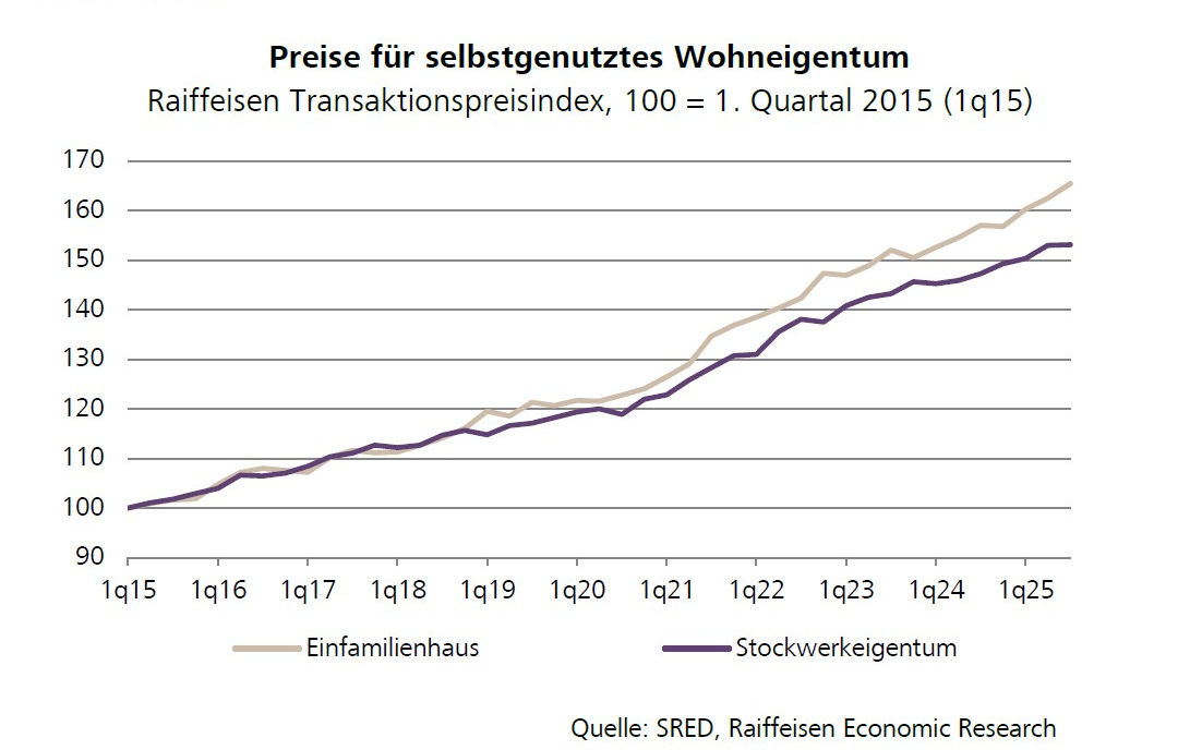 «Die Preisdynamik beim selbstgenutzten Wohneigentum hat sich zuletzt nicht mehr beschleunigt, sie bleibt aber weiterhin sehr stark», sagt Raiffeisen-Chefökonom Fredy Hasenmaile. «Die bis auf absehbare Zeit tiefen Zinsen sorgen dafür, dass in den eigenen vier Wänden viel geringere Wohnkosten anfallen als in einer Mietwohnung. Die Nachfrage nach Wohneigentum bleibt damit hoch.»