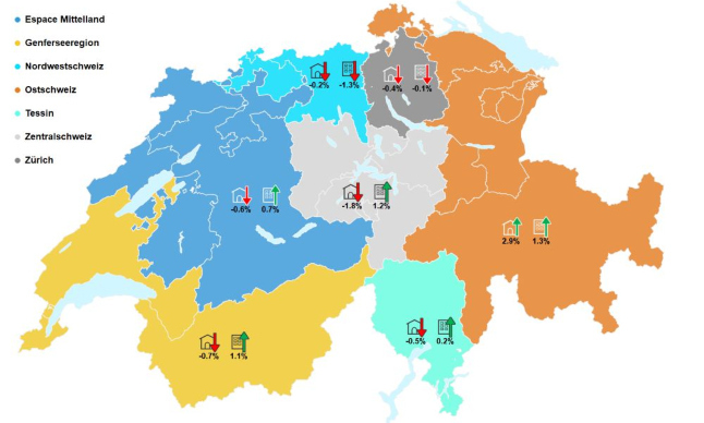 Demgegenüber gab es im Markt für Einfamilienhäuser einen Rückgang in fast allen Regionen. Die Spanne reicht von -1.8 Prozent in der Zentralschweiz bis -0,2 Prozent in der Region Nordwestschweiz. In der Ostschweiz stiegen die Angebotspreise hingegen mit 2,9 Prozent deutlich.