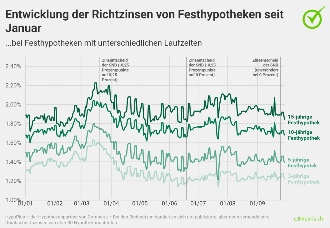 Die von mehr als 30 Kreditinstituten öffentlich publizierten Referenzzinsen (sogenannte Richtzinsen) für 10-jährige Festhypotheken lagen zum Stichtag 30. September bei 1,68 Prozent, 0,09 Prozentpunkte niedriger als Ende Juni und nur 0,01 Prozentpunkte tiefer als zum Jahresbeginn. Der Richtsatz für 5-jährige Festhypotheken lag bei 1,39 Prozent ähnlich hoch wie Ende Juni mit 1,4 Prozent (Jahresbeginn 2025 1,5 Prozent).
