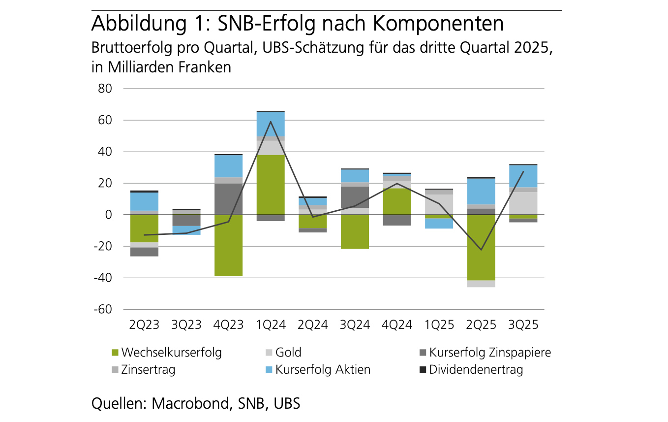 Die grössten Treiber bei der Wertentwicklung dürften dabei Gold und Aktien gewesen sein, heisst es weiter. Der Goldpreis in Schweizer Franken stieg im dritten Quartal um 16 Prozent. Das habe der SNB einen Gewinn von rund 14 Milliarden Franken eingebracht. Der Goldbestand dürfte im dritten Quartal auf über 100 Milliarden Franken angestiegen sein.