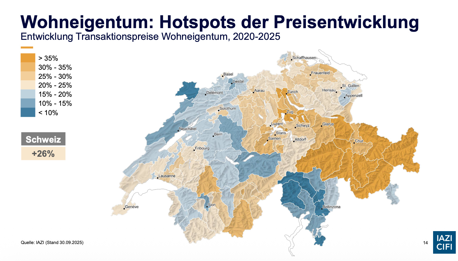 Seit 2020 seien die Immobilienpreise hierzulande um 26 Prozent gestiegen, im vergangenen Jahr um 2,6 Prozent. Die Stärke der Nachfrage in der Schweiz lasse sich auch daran ablesen, dass hier während der Phase der höheren Zinsen der Preisanstieg ungebrochen weitergegangen ist. In allen anderen europäischen Ländern habe es teilweise deutliche Rückgänge gegeben.