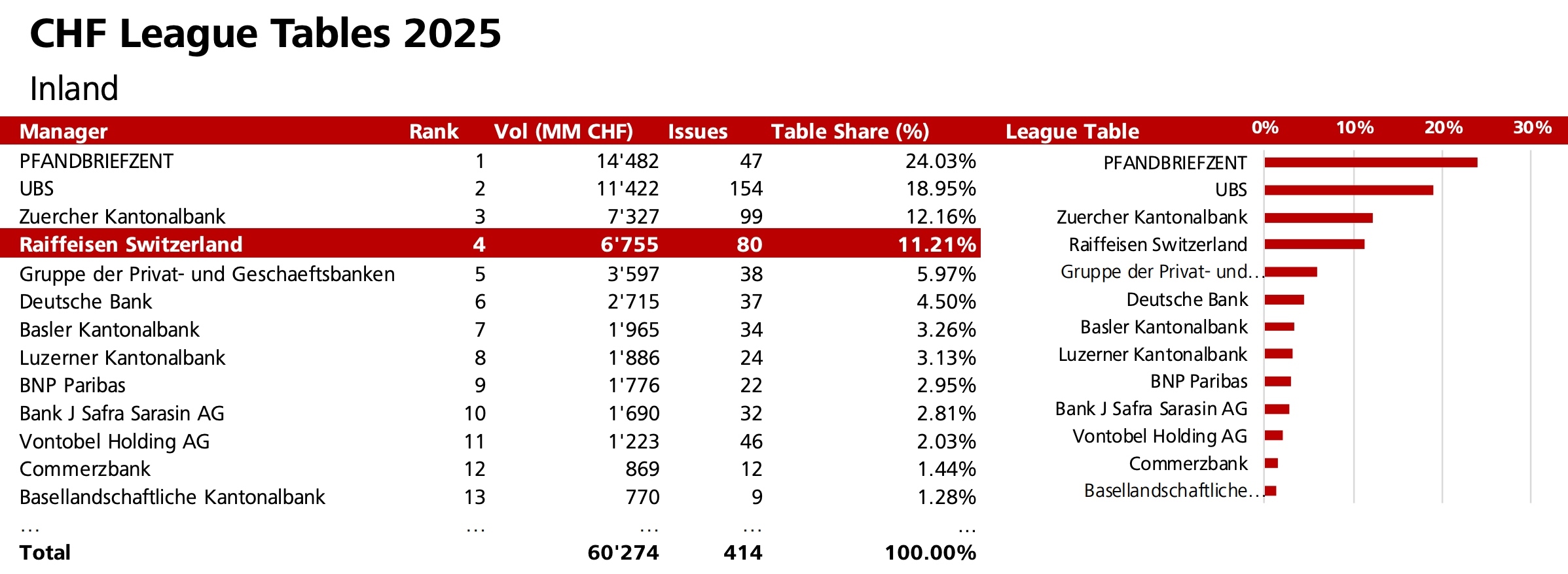 Eine solche League Table für das Inlandsegment (ohne die Anleihen der Eidgenossenschaft, wo die Nationalbank als Hausbank des Bundes federführend ist) hat kurz vor Jahresende auch Raiffeisen Schweiz in ihrem Kapitalmarktrückblick erstellt. Raiffeisen hat 2025 verschiedentlich unterstrichen, dass das Emissionsgeschäft von strategischer Bedeutung ist und insbesondere auch den Aufbau eines eigenen Bonitätsresearch in die Wege geleitet.