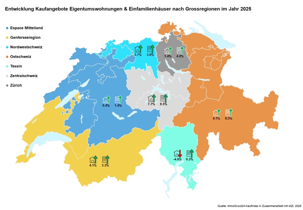 Bei den Eigentumswohnungen haben die Zentralschweiz 2025 mit einem markanten Preisanstieg von 9,5 Prozent das Feld angeführt. Es folgen die Ostschweiz (+6,5 Prozent), die Grossregion Zürich (+4,2 Prozent), Nordwestschweiz (+3,6 Prozent) und die Genferseeregion (+3,3 Prozent). Deutlich zurückhaltender entwickelte sich das Mittelland (+1,4 Prozent) und im Tessin (+0,3 Prozent) bewegten sich die Angebotspreise nur zaghaft nach oben.