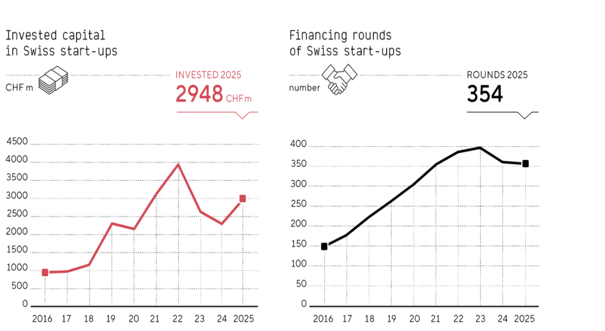 Insgesamt stiegen die Investitionen in Schweizer Startups 2025 um rund 24 Prozent auf 2,95 Milliarden Franken. Der Spitzenwert aus dem Jahr 2022 mir 3,97 Milliarden Franken liegt damit noch weit entfernt. Die Zahl der Finanzierungsrunden ging 2025 um 3 auf 354 zurück.