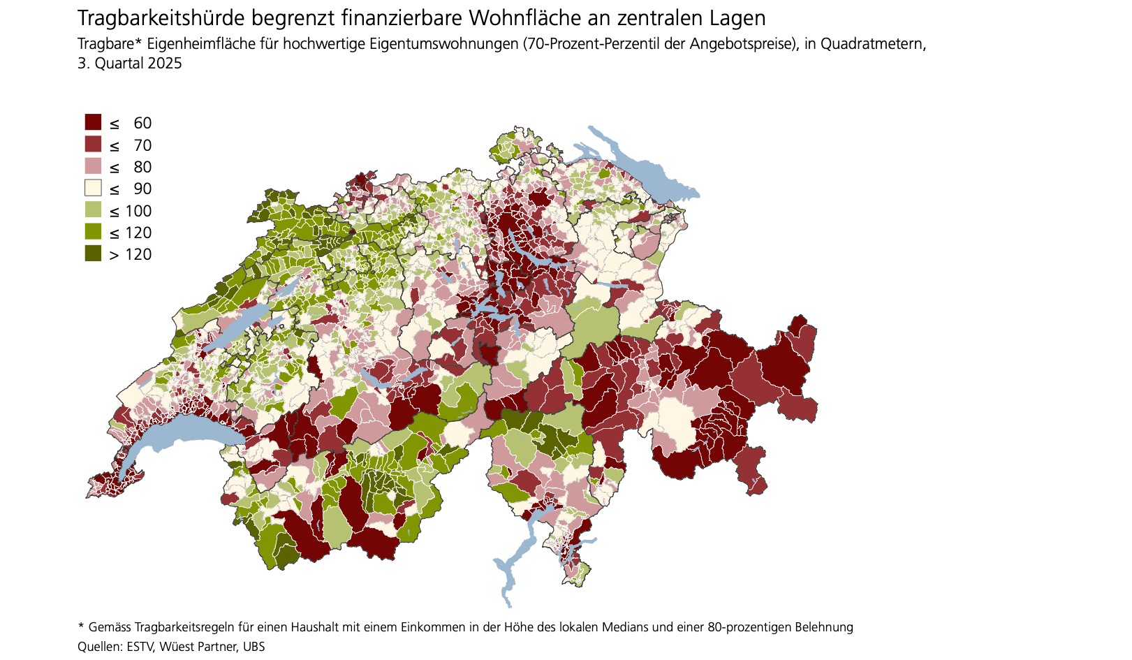 Die Tragbarkeitshürden begrenzt auch die finanzierbare Wohnfläche. Bezogen auf ein Durchschnittseinkommen liegt die tragbare Eigenheimfläche für hochwertige Eigentumswohnungen im Quadratmetern etwa in Zürich oder anderen urbanen Zentren nur noch bei rund 60 Quadratmetern. Das lasse sich auch an