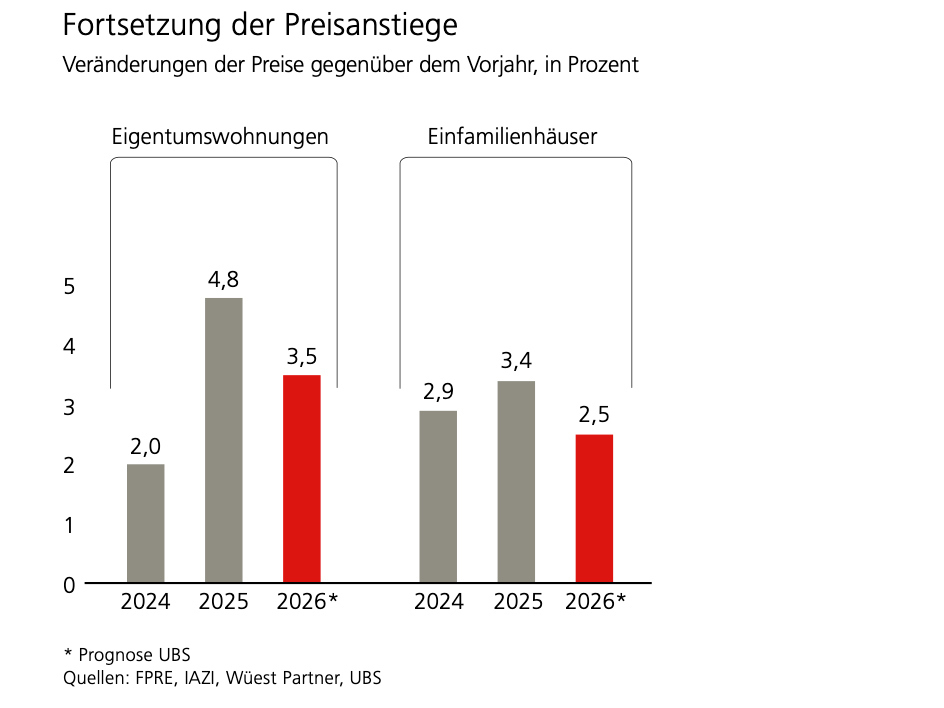 Die hohe Nachfrage treibt die Preise weiter. So wurden Eigentumswohnungen 2025 um 4,8 Prozent teurer und Einfamilienhäuser um 3,4 Prozent. Im laufenden Jahr dürften sich das schwache Wirtschaftswachstum und die steigende Unsicherheit am Arbeitsmarkt bremsend auf die Nachfrage auswirken. Für 2026 rechnen die UBS-Experten mit weiteren Steigerungen um 3,5 bzw. 2,5 Prozent und damit mit einer leichten Abschwächung der Preisanstiege.