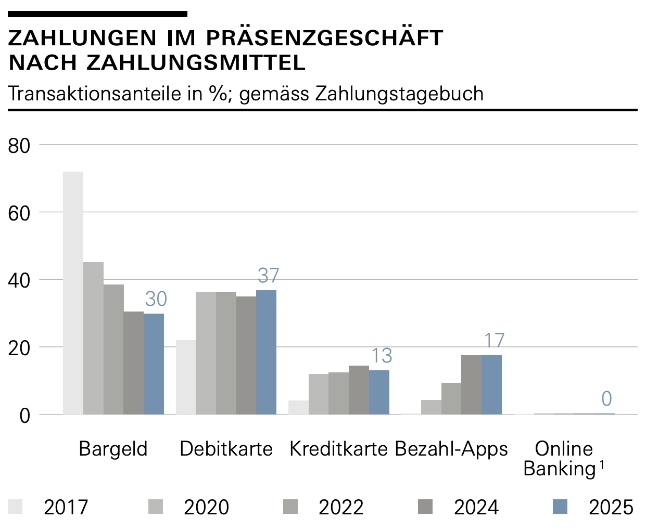 Ein Grossteil der Bevölkerung trägt Bargeld bei sich, besitzt sowohl Debitkarten als auch Kreditkarten und verfügt über Bezahl-Apps. Trotz der Vielfalt an bargeldlosen Zahlungsmitteln wird Bargeld weiterhin regelmässig genutzt.
