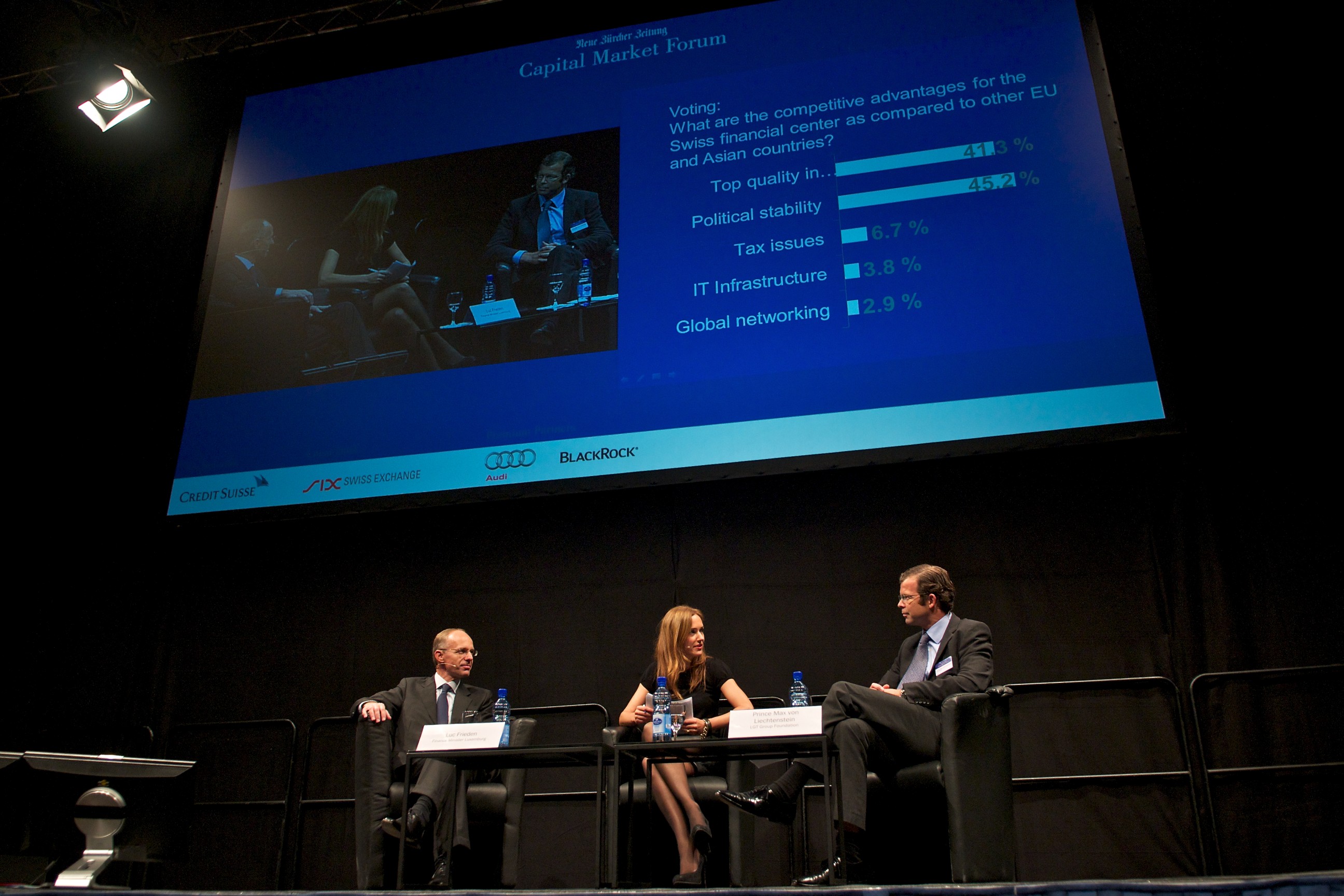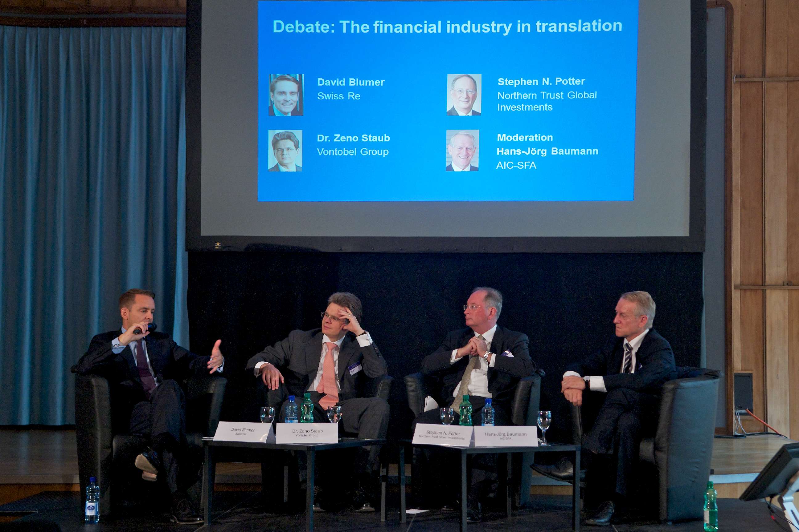 Als Referenten waren unter anderem der Präsident des Direktoriums der Schweizerischen Nationalbank, Thomas Jordan, Swiss-Re-Verwaltungsratspräsident Walter Kielholz, Finma-Chef Patrick Raaflaub und Luxemburgs Finanzminister Luc Frieden anwesend sowie UBS-Verwaltungsratspräsident Axel Weber oder der frühere SNB-Präsident und heutige BlackRock-Vice-Chairman Philipp Hildebrand.