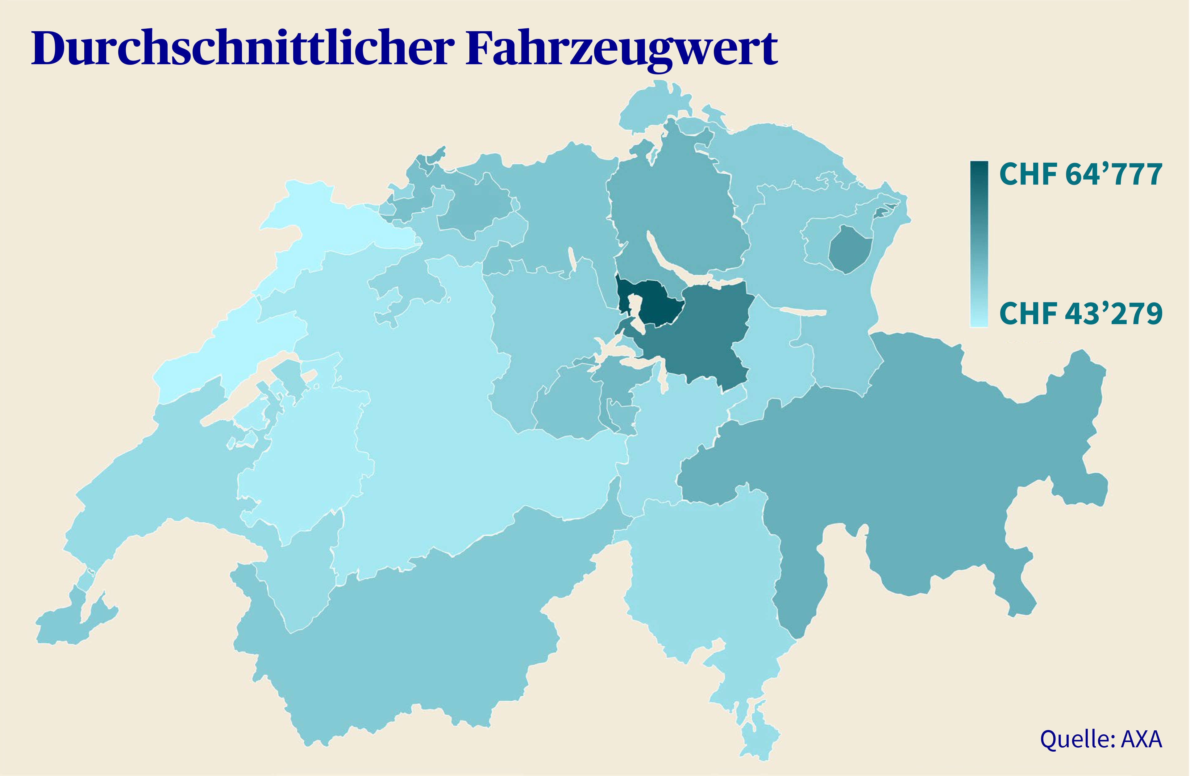 Im Kanton Zug werden die teuersten Autos gefahren. Der durchschnittliche Fahrzeugwert liegt dort mit 65'000 Franken mehr als 30 Prozent über dem Schweizer Schnitt. Dies ergibt eine Auswertung der AXA Versicherung für das Jahr 2023, die gestern veröffentlicht wurde.
