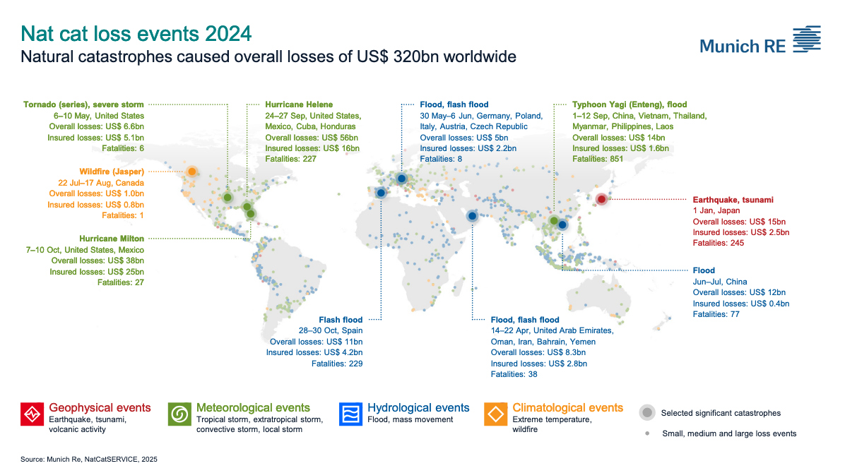 Das der Klimawandel Naturkatastrophen wie Wirbelstürme, Überschwemmungen oder eben Grossbrände begünstigt, ist nicht mehr zu leugnen. Das belegen auch die nun von dem Rückversicherer Munich Re vorgelegten Schätzungen zu den Schäden aus solchen Ereignissen im Jahr 2024.
