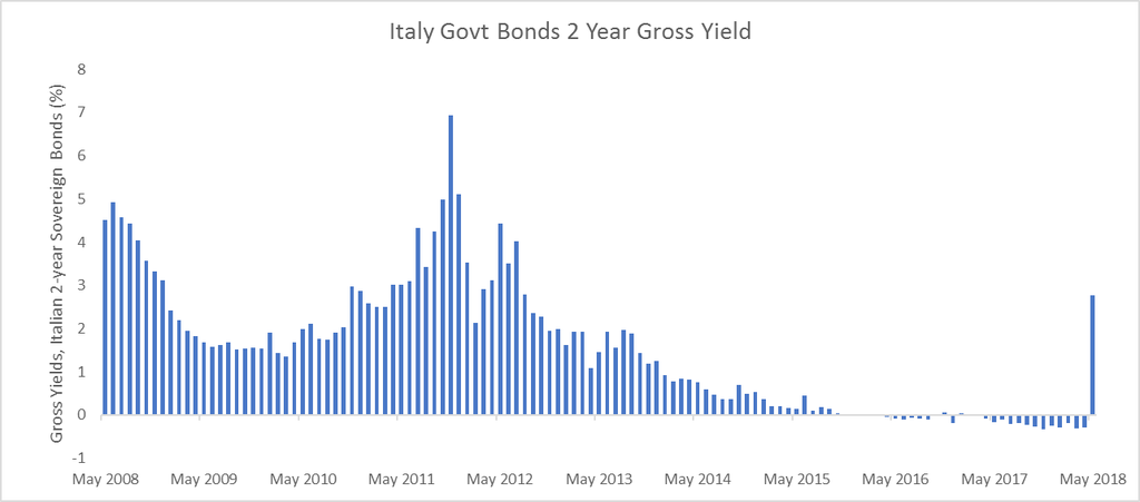 Vielleicht war es diese Einschätzung, die die Obligationenmärkte in einem Ausmass erschreckte, wie es seit Jahren nicht mehr der Fall war. Sie liess die Bruttorenditen für die zweijährigen Staatsanleihen Italiens von einem Tiefststand am 4. Mai von Minus 0,331 Prozent am 29. Mai auf ein Plus von 2,826 Prozent steigen.