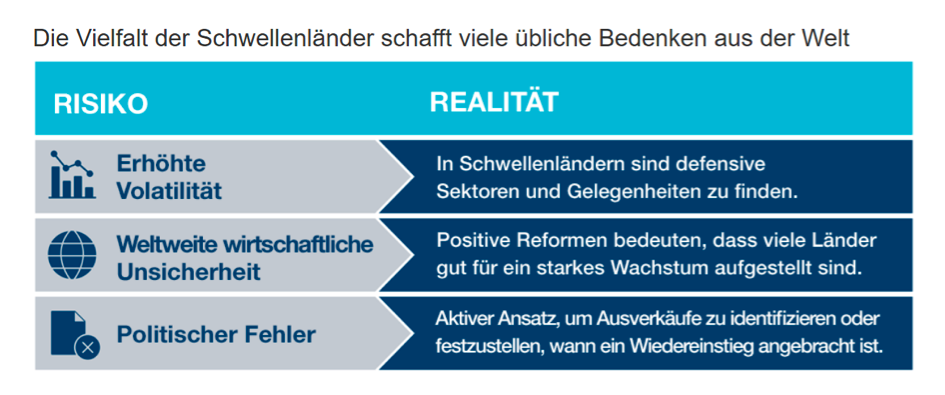 Zahlreiche aufstrebende Märkte offerieren defensive Chancen, die andere Anlageklassen in Phasen erhöhter Risikoaversion übertreffen können. Das steht im Gegensatz zur weithin verbreiteten Auffassung, dass es sich um eine stark schwankende Anlageklasse mit höherem Beta handelt.