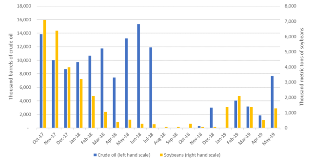 (Abb. 1: US-Rohstoffexporte nach China – Rohöl und Sojabohnen, Quellen: US-Energieinformationsbehörde; US-Landwirtschaftsministerium)