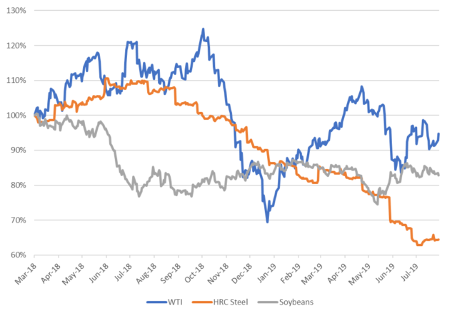 Analog zur Situation bei US-amerikanischem Stahl, der unter einer niedrigen Nachfrage leidet, machen sich die Sekundäreffekte des Handelskrieges gerade in der Realwirtschaft bemerkbar. Die unterschiedlichen Entwicklungen bei Rohstoff-Assetklassen und die zunehmenden regionalen Preisdivergenzen schaffen aber auch Handelsmöglichkeiten.