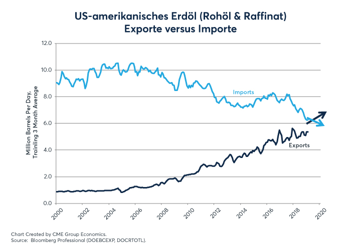 Wir haben mehrere vorsichtige Beobachtungen dazu gemacht, ob der Risikoaufschlag auf Rohöl aus dem Nahen Osten so gering bleiben wird, wie dies Anfang 2020 den Anschein hat. Erstens sinkt der Investitionsaufwand in den schieferölproduzierenden Regionen in den USA, was darauf schliessen lässt, dass sich auch das Produktionswachstum verlangsamen wird.