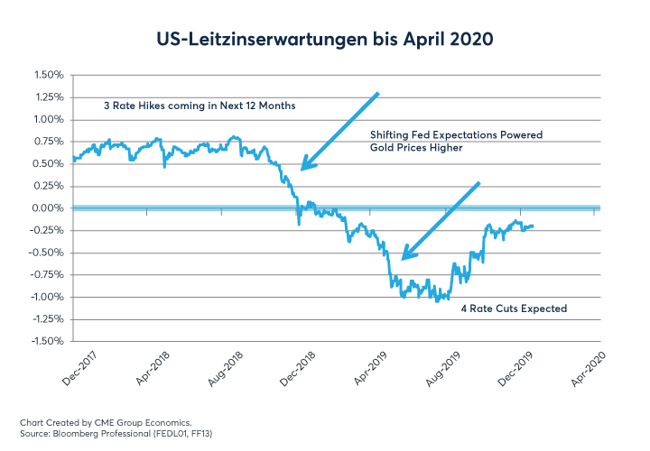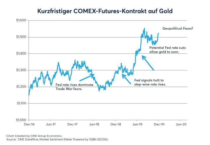 Als die Fed die Zinssätze anhob, sank der Goldpreis. Sobald die Fed jedoch angab, keine weiteren Zinserhöhungen im Jahr 2019 mehr anzustreben, stieg der Goldpreis wieder. Und als die Fed im vergangenen Jahr schliesslich Zinssenkungen ankündigte, schoss der Goldpreis noch einmal deutlich in die Höhe. Mit der Ankündigung der Fed, die Zinssätze vorerst stabil zu halten, ist es nun offen, ob das Edelmetall seine Rallye 2020 fortsetzen kann.