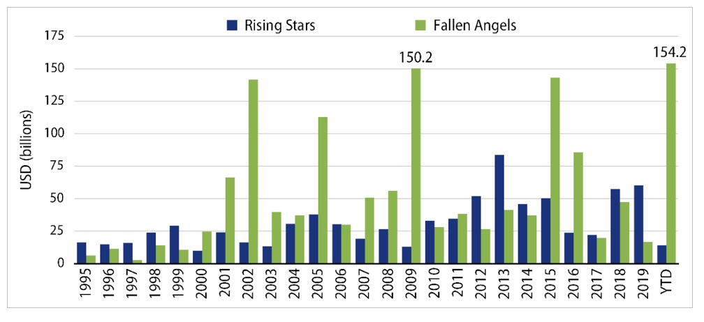 Wie Thomas V. McMahon von Western Asset bemerkt, hat dies eine Fülle von «Fallen Angels» ohne Präzedenzfälle in jüngster Zeit hervorgebracht. Mit BBB-Emittenten von 466 Milliarden Dollar auf der negativen Watchlist wird das Volumen der BBB-Emittenten in der Bilanz des Jahres 2020 weiter zunehmen. Die Schätzungen der Wall-Street-Strategen für das Gesamtjahr 2020 zwischen 200 und 500 Milliarden Dollar schwanken.