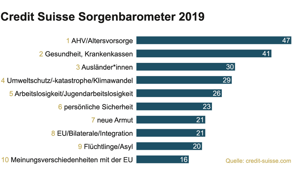 Gemäss der Umfrage, die vom Forschungsinstitut gfs.bern im Auftrag der Credit Suisse erhoben wird, nennen 47 Prozent der Befragten das Thema AHV/Altersvorsorge als ihre Hauptsorge, gefolgt von der Sorge um die Gesundheit/Krankenkasse mit 41 Prozent. Zudem wird die Altersvorsorge als politisches Ziel genannt, das prioritär zu behandeln sei.
