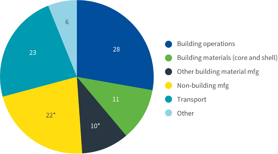 Weltweit entfallen 39 Prozent aller CO2-Emissionen auf die Bauwirtschaft.1 Treibhausgasemissionen im Zusammenhang mit dem Betrieb der Bauobjekte machen davon etwa 28 Prozentpunkte aus.
