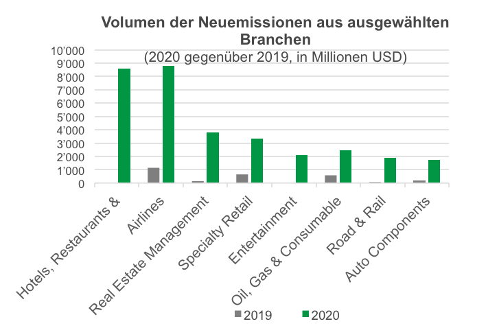 Wir haben diese Beobachtung in der Vergangenheit bei Emittenten aus der Immobilienbranche nach der globalen Finanzkrise, aber auch in der Energiebranche nach dem Fall der Ölpreise gemacht. In jüngster Zeit haben wir einen starken Anstieg von Neuemissionen aus Branchen beobachtet, die von Covid-19 betroffen sind: