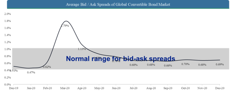 Darüber hinaus beobachten wir eine hohe Liquidität auf dem Wandelanleihemarkt mit engen Bid-Ask-Spreads-Niveaus und einem deutlichen Anstieg des Transaktionsvolumens bei Wandelanleihen.