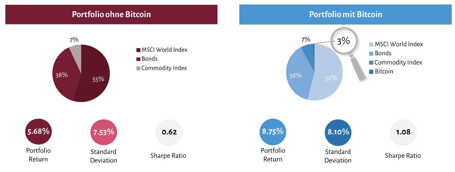 Der positive Effekt durch Bitcoin lässt sich auch an der Veränderung der Sharpe Ratio ablesen, eine häufig genutzte Portfolio-Kennzahl zur Ausweisung der risikobereinigten Rendite.