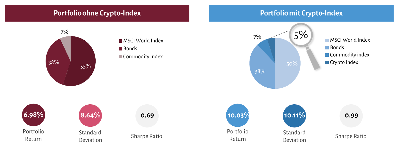 Ebenso ändert sich die Sharpe Ratio von o.69 auf 0.99. Somit zeigt dieses Beispiel: Nicht nur Bitcoin allein, sondern auch eine Kombination verschiedenster Kryptowährungen in Form eines Krypto-Index können eine sinnvolle Diversifikation eines Portfolios darstellen.