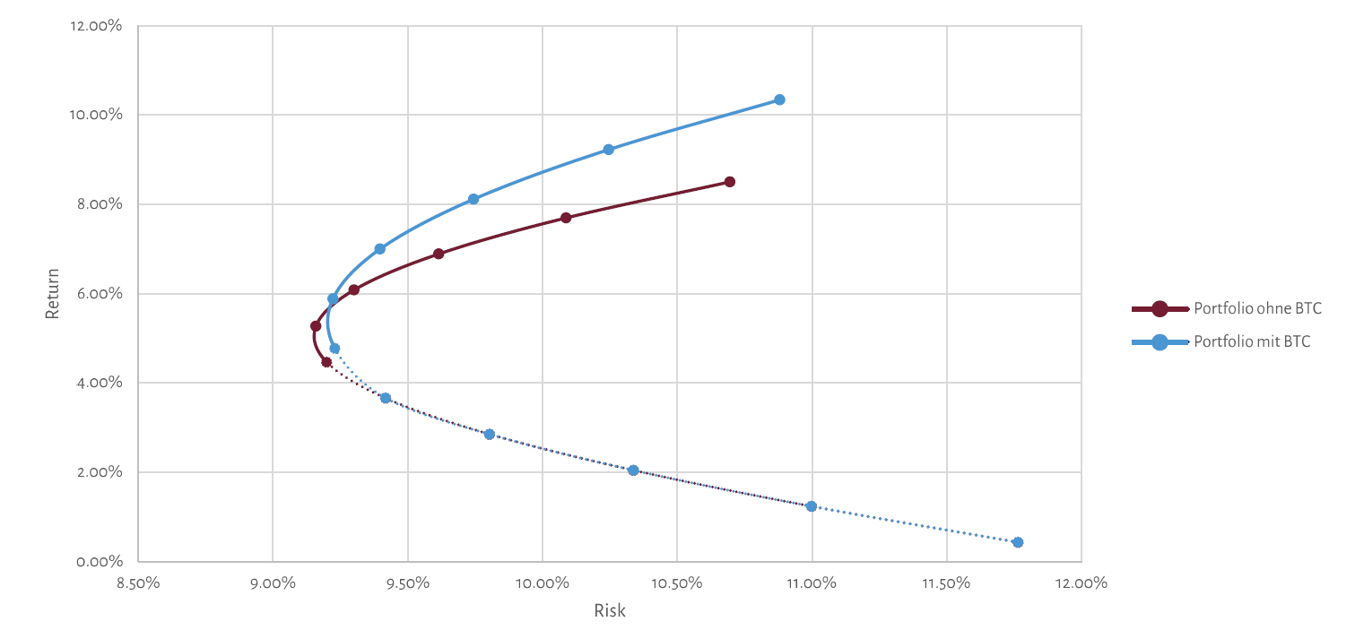 Eine solche Verschiebung der Effizienzkurve nach oben resultiert für diejenigen Portfolio3, denen digitale Assets als Zusatz beigemischt worden sind.