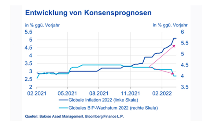 Die durchschnittlichen Prognosen von Analysten zeigen daher, dass die Erwartungen für die Inflation für das laufende Jahr deutlich nach oben revidiert wurden (+1.2 Prozentpunkte seit Januar 2022), während die Prognose für das Weltwirtschaftswachstum sinkt (-0.4 Prozentpunkte).
